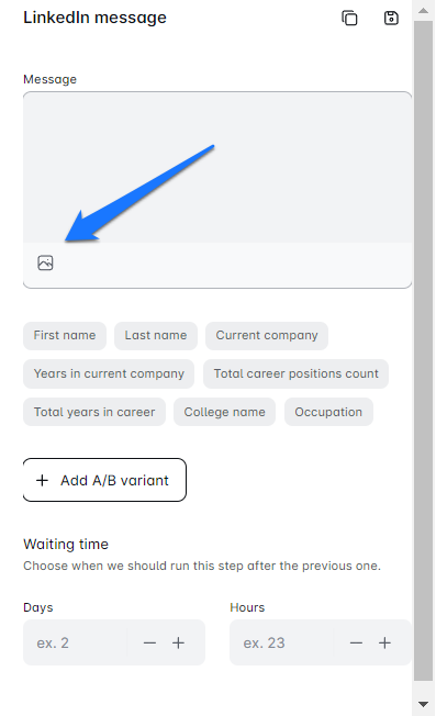 - For email messages, choose where to insert your image or GIF. For LinkedIn messages and InMails, Merakyn will place your personalized images and GIFs at the bottom of the message.