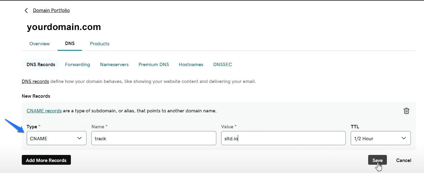 - This time, under record type in the dropdown menu, find CNAME, and paste the details provided in Merakyn’s Custom tracking domain settings.